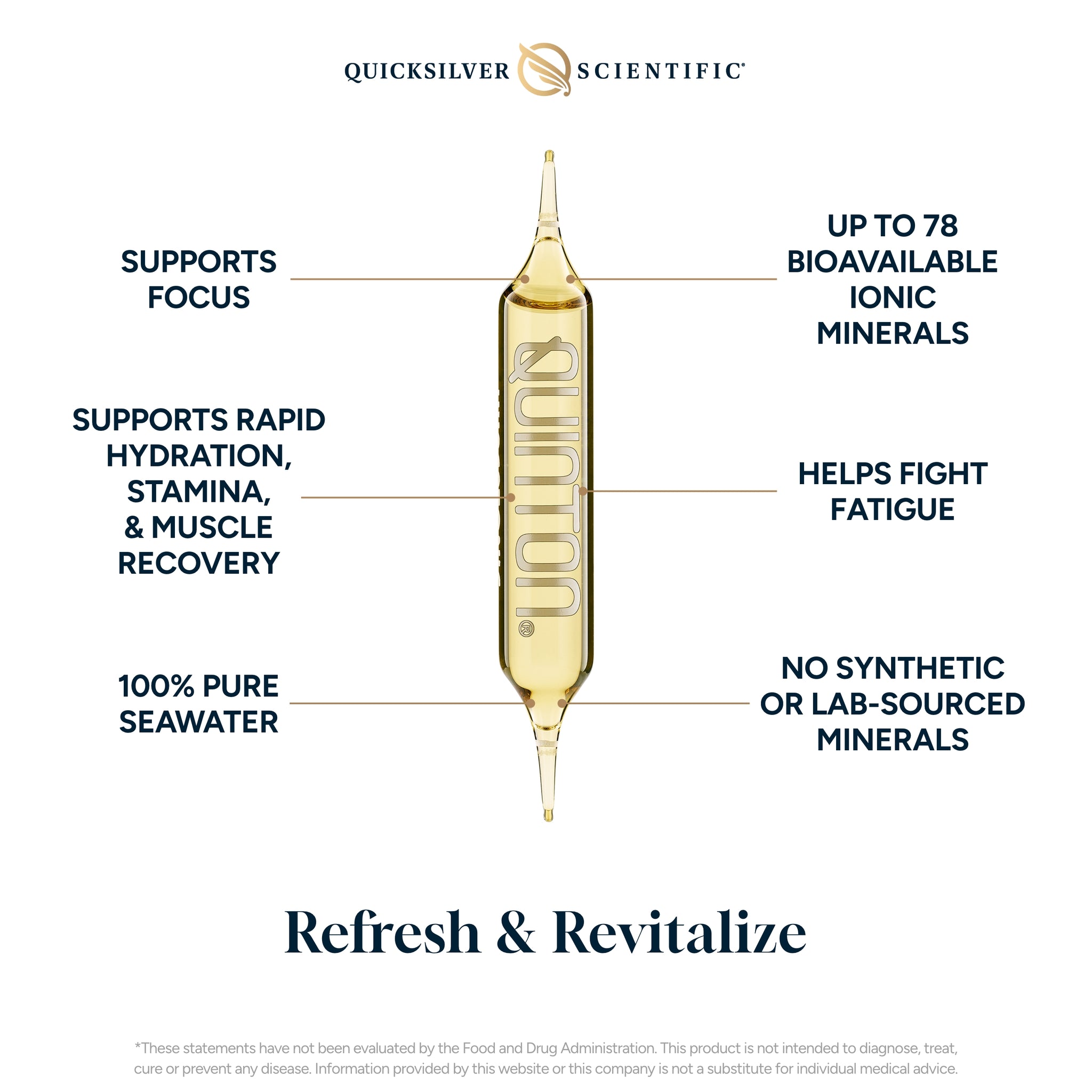 Quinton® Isotonic Ampoules provide 100% pure seawater diluted to match the body’s internal mineral concentration, delivering up to 78 bioavailable minerals and trace elements in a gentle, restorative form. Designed to support hydration, cellular balance, and nervous system calm, this isotonic formula helps replenish electrolytes, enhance vitality, and maintain healthy pH and detoxification pathways.