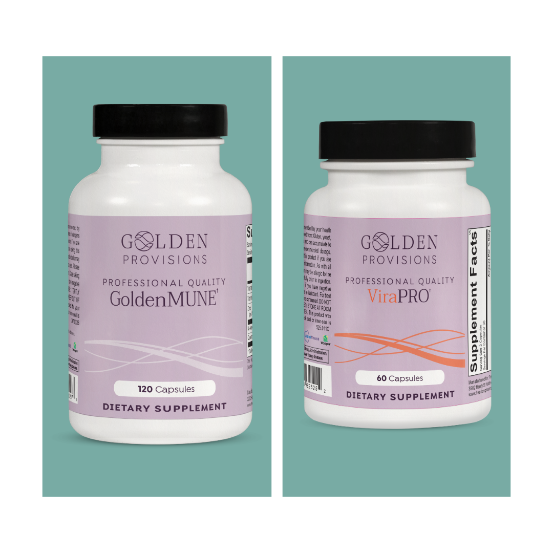 This duo is designed for everyday immune strength and quick action at the first sign of a cold, flu, or seasonal exposure. GoldenMUNE provides steady daily defense with quercetin, NAC, vitamin C, zinc, and vitamin D3. ViraPRO steps in when you need rapid support to ease congestion, soothe irritation, and help you recover faster when something is going around. Together, they create a complete system for staying well and responding quickly when your immune system needs backup.