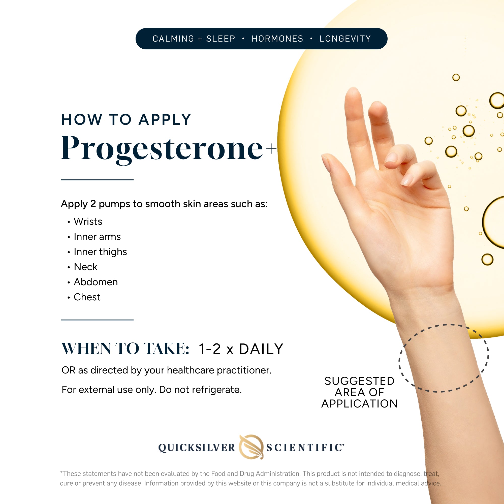 Apply 2 pumps (12 mg progesterone) to smooth skin areas such as wrists, inner arms, thighs, neck, abdomen, or chest once or twice daily, or as directed by a healthcare professional.